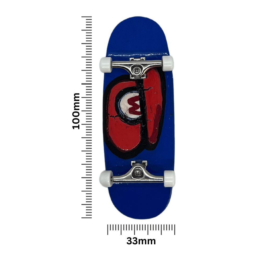 ‘Cracking M’ Artist Professional Handmade Fingerboard 33mm x 100mm complete with steel trucks and urethane bearing wheels and hand painted design on deck.
