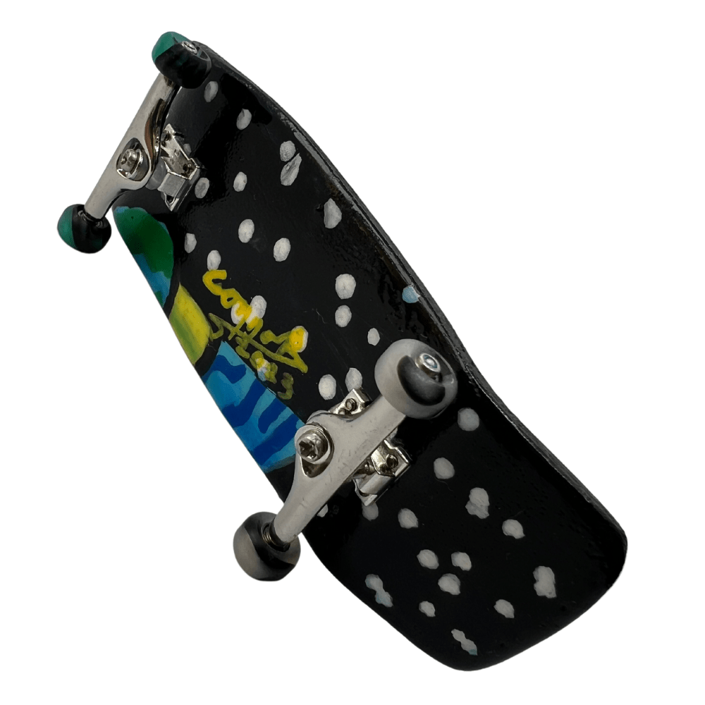 ‘A Peek of the Universe’ artist handmade professional fingerboard 36mm x 100mm complete with steel trucks and special limited edition swirl urethane bearing wheels hand painted with signed original art. This fingerboard includes a Certificate of Authenticity.