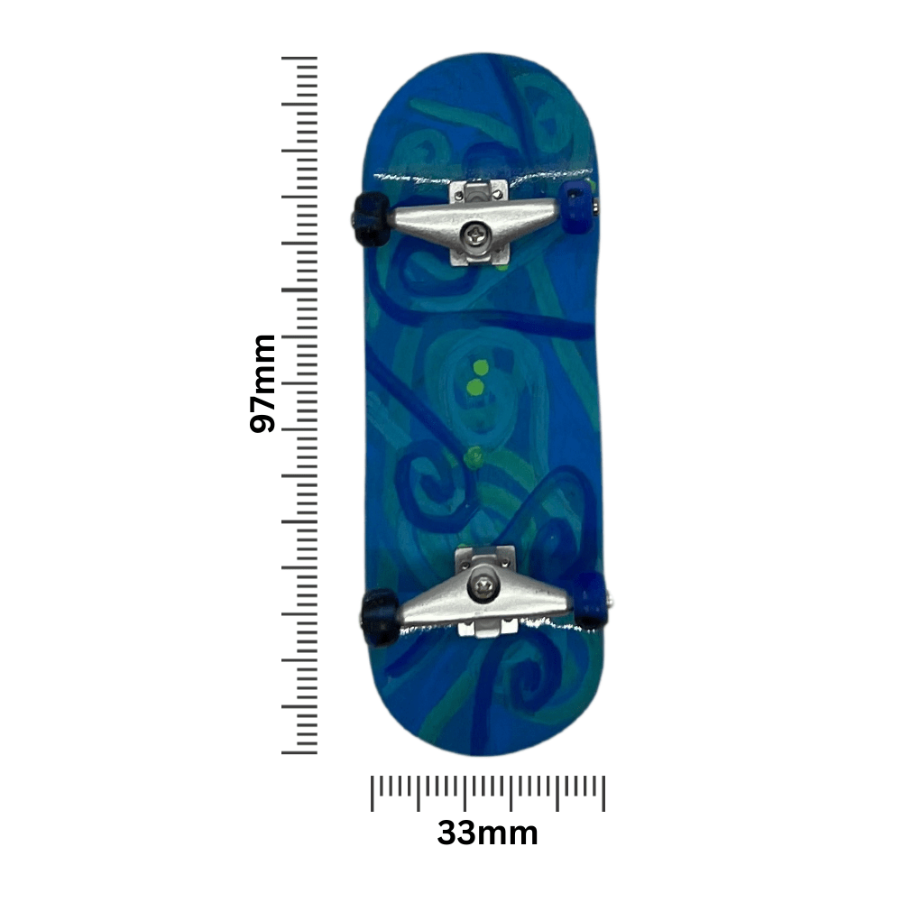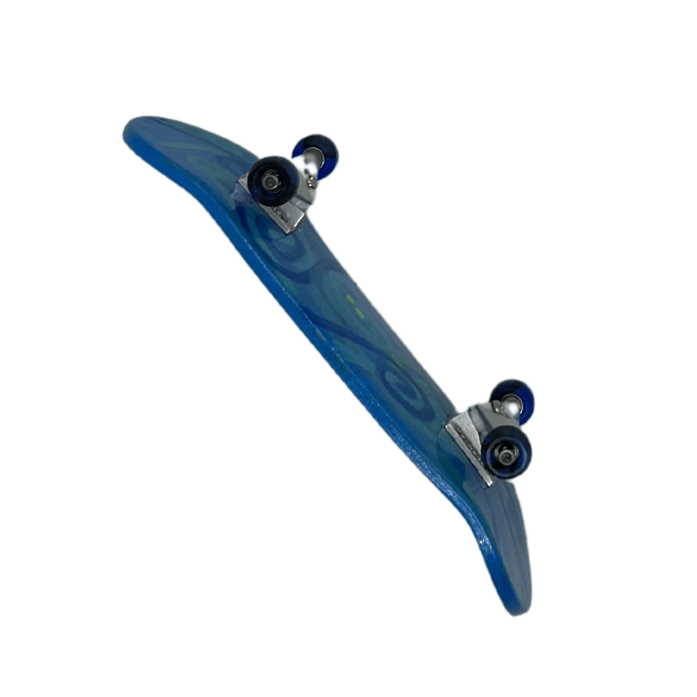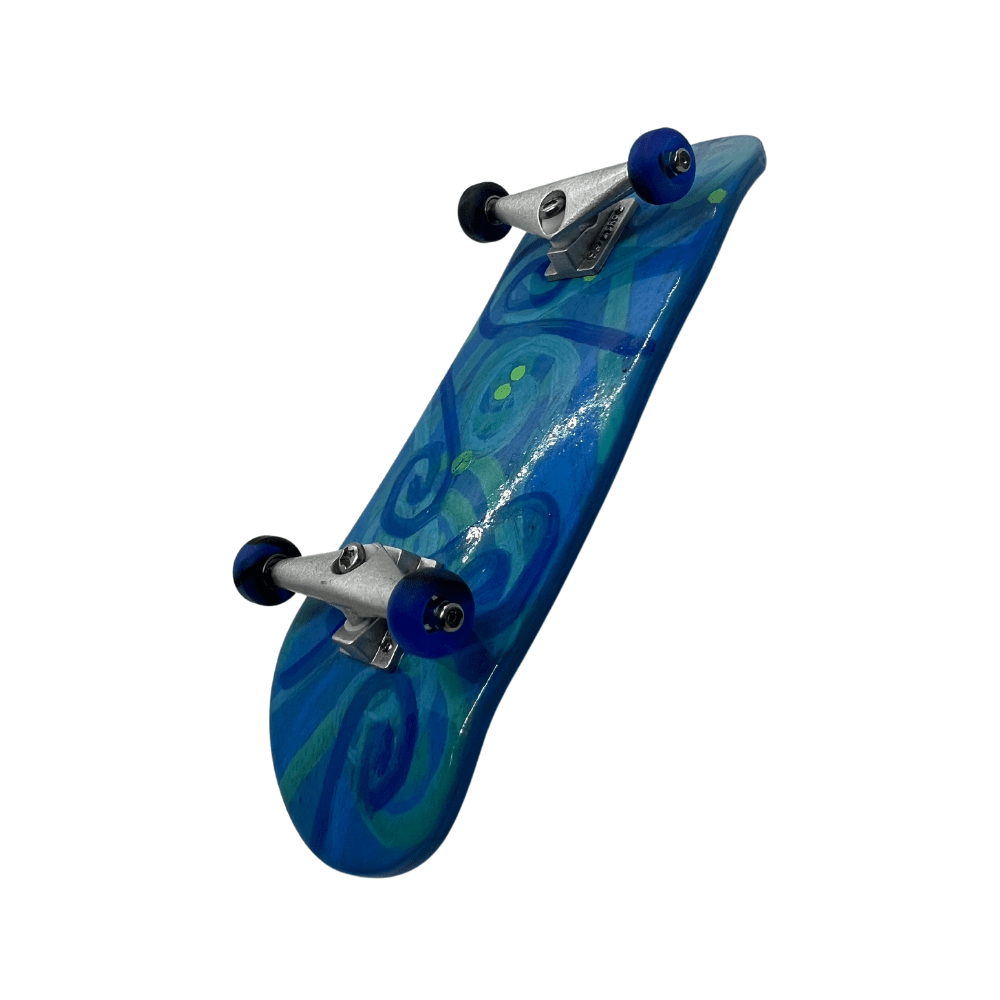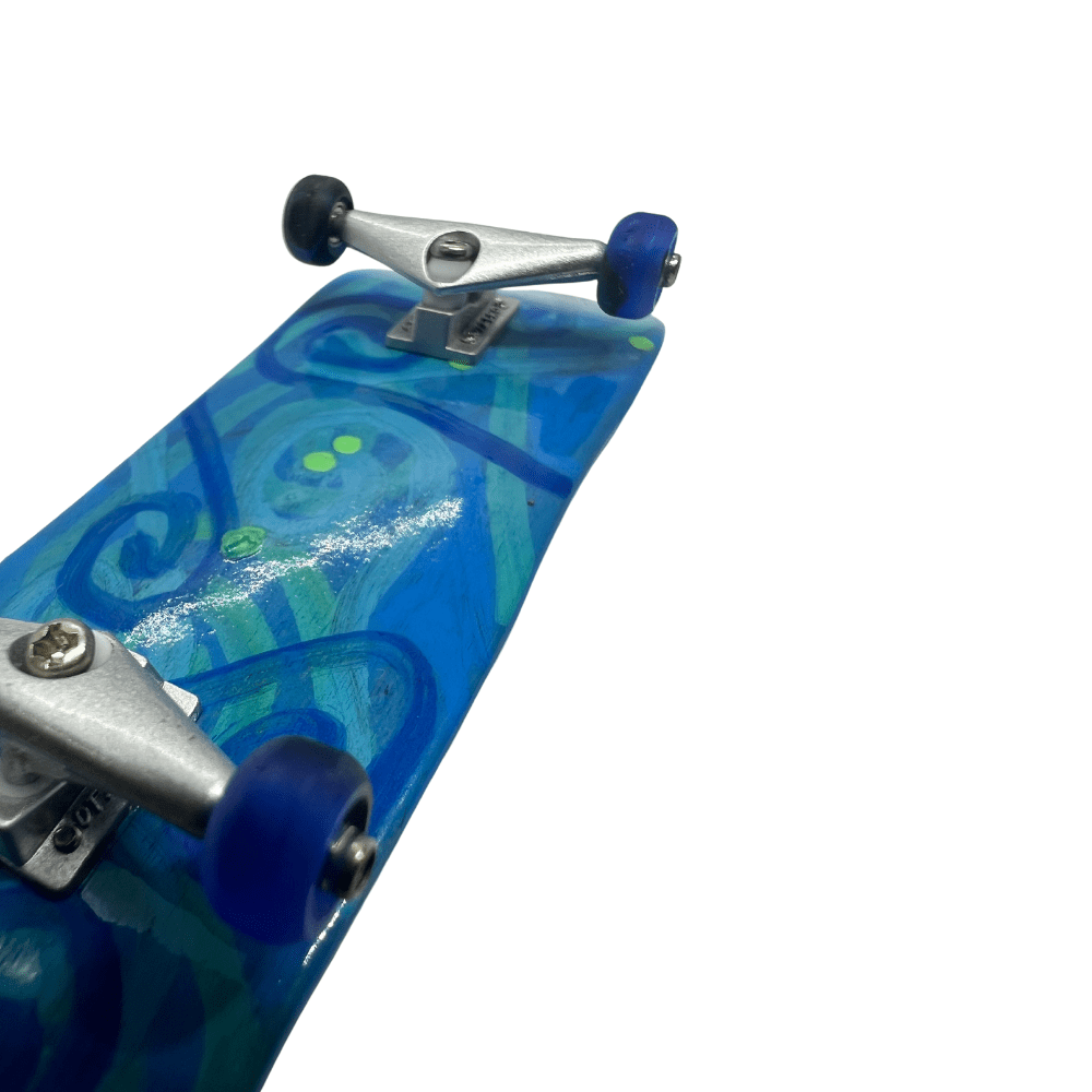 ‘Deep Blue Sea’ artist handmade professional fingerboard 33mm x 97mm complete with steel trucks and special limited edition swirl fiberglass bearing wheels hand painted with original art.