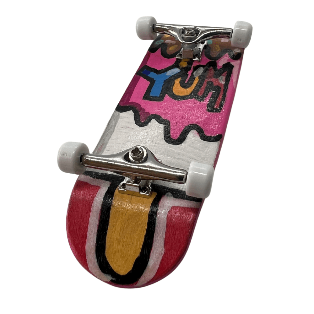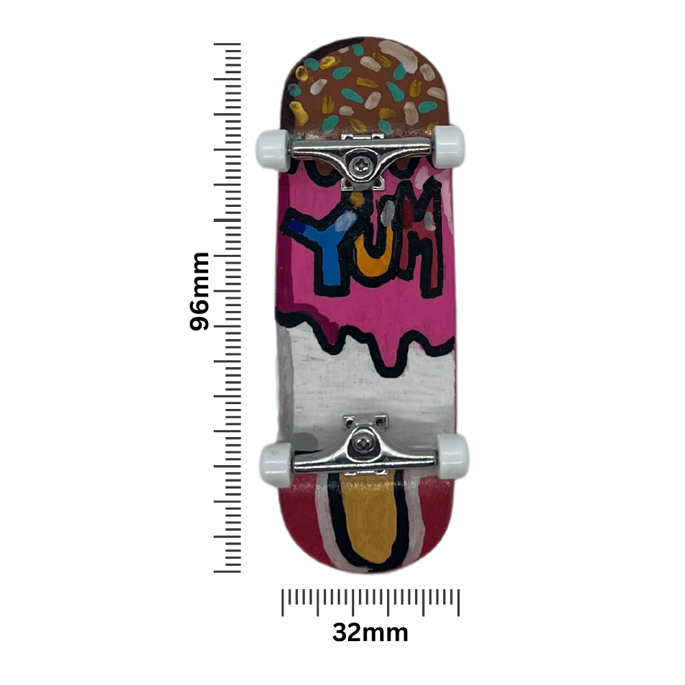 ‘Fruit Lolly’ Artist Professional Handmade Fingerboard 32mm x 96mm complete with steel trucks and urethane bearing wheels and hand painted original design on deck.