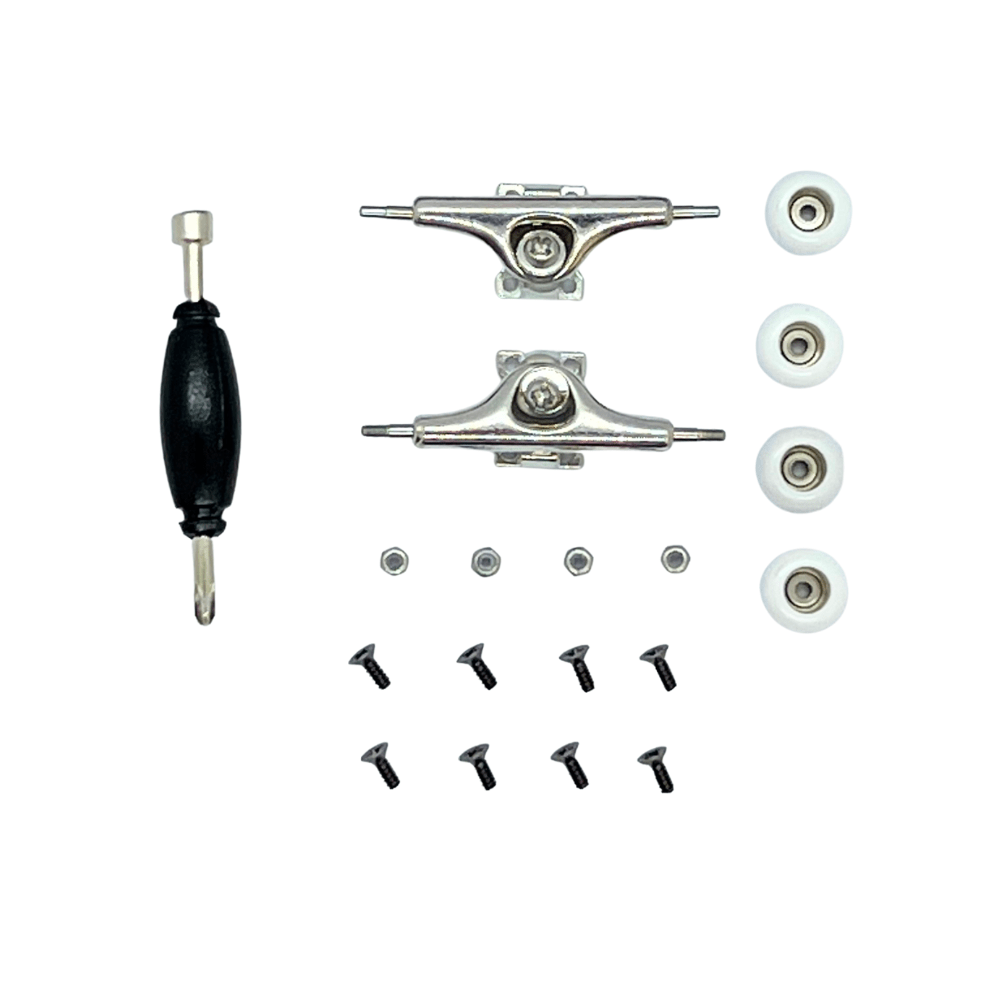 Unassembled fingerboard set compose of 1 x deck, 2 x trucks, 8 screws, 4 x locknuts, 4 x wheels, 1 x tool and 1 x foam grip