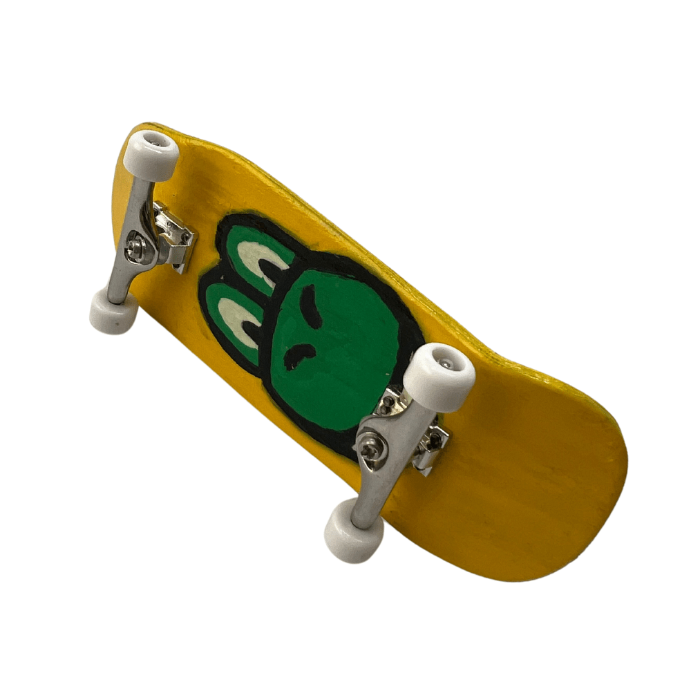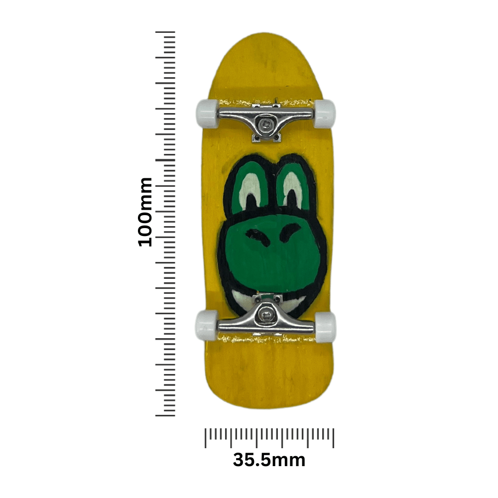 ‘Dino’ Artist Professional Handmade Fingerboard 35.5mm x 100mm complete with steel trucks and urethane bearing wheels and hand painted design on deck.