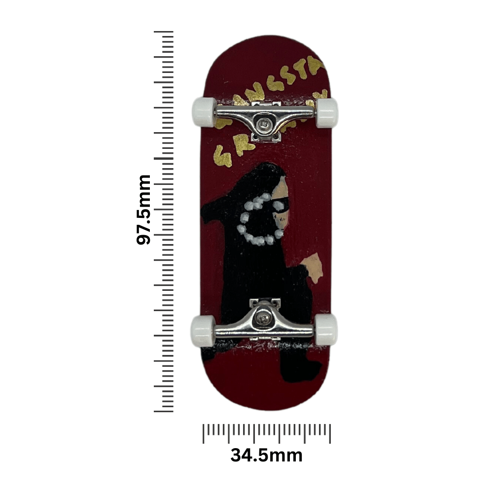 ‘Gangsta Granny’ Artist Professional Handmade Fingerboard 34.5mm x 97.5mm complete with steel trucks and urethane bearing wheels and hand painted design on deck.