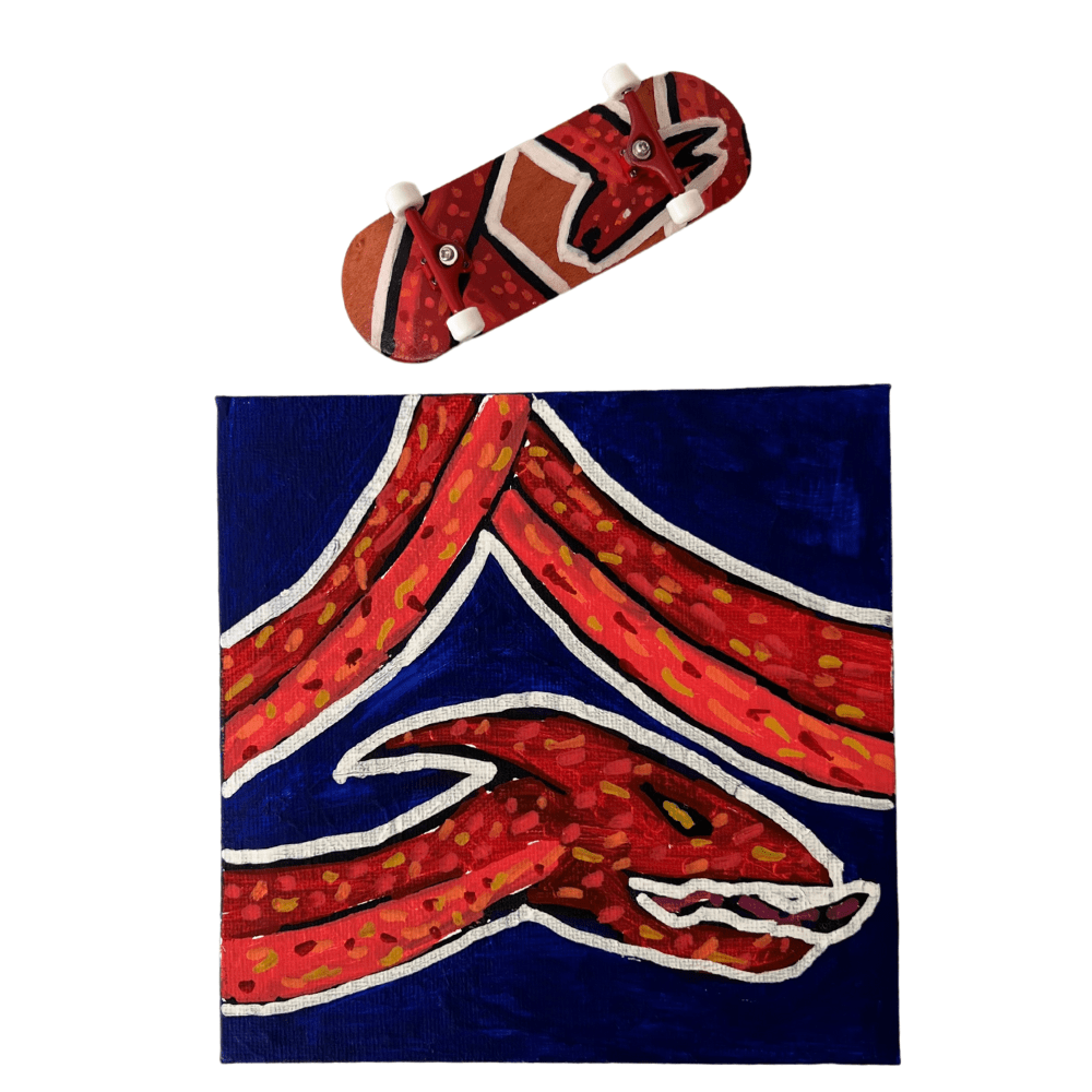 ‘Red Dragon’ Artist Professional Handmade Fingerboard 33mm x 99mm complete with steel trucks and urethane bearing wheels and hand painted original design on deck.