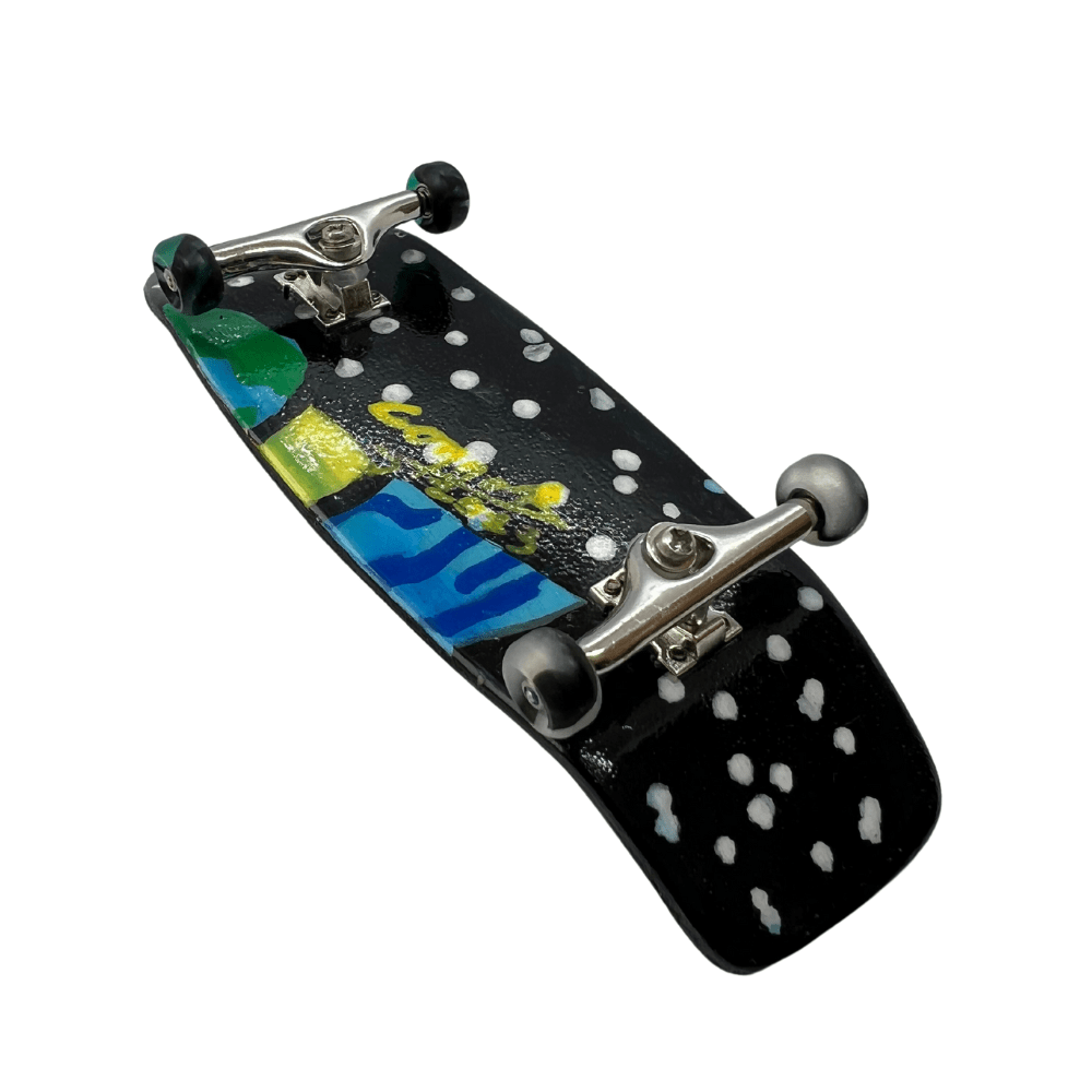 ‘A Peek of the Universe’ artist handmade professional fingerboard 36mm x 100mm complete with steel trucks and special limited edition swirl urethane bearing wheels hand painted with signed original art. This fingerboard includes a Certificate of Authenticity.