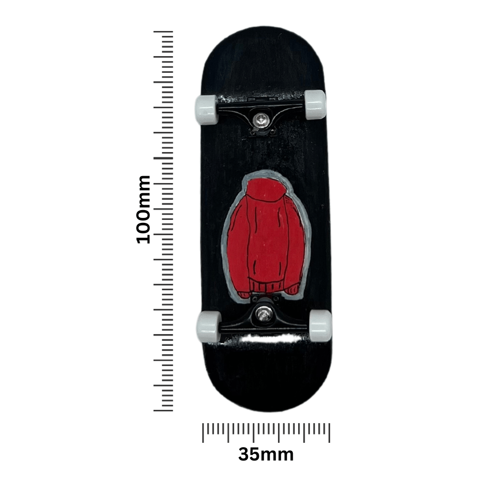 ‘Red Jumper’ Artist Professional Handmade Fingerboard 35mm x 100mm complete with steel trucks and urethane bearing wheels and hand painted original design on deck.