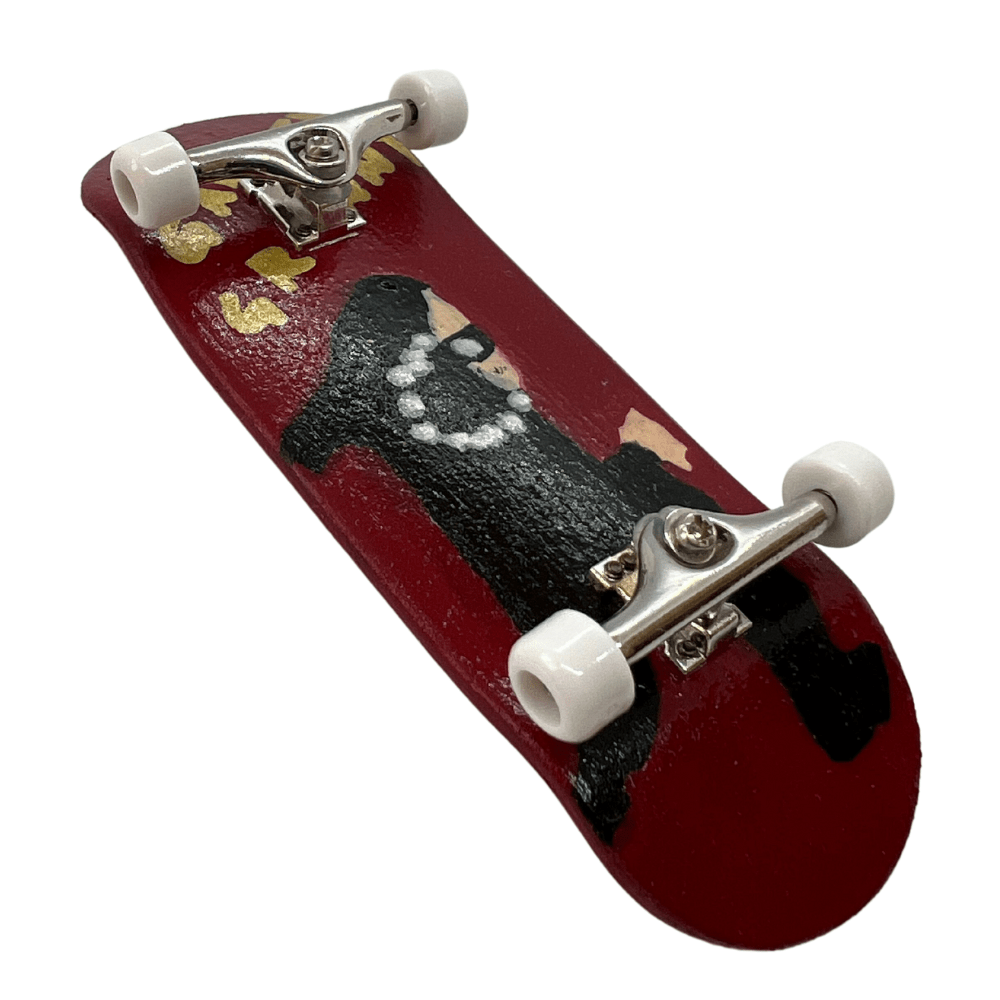 ‘Gangsta Granny’ Artist Professional Handmade Fingerboard 34.5mm x 97.5mm complete with steel trucks and urethane bearing wheels and hand painted design on deck.